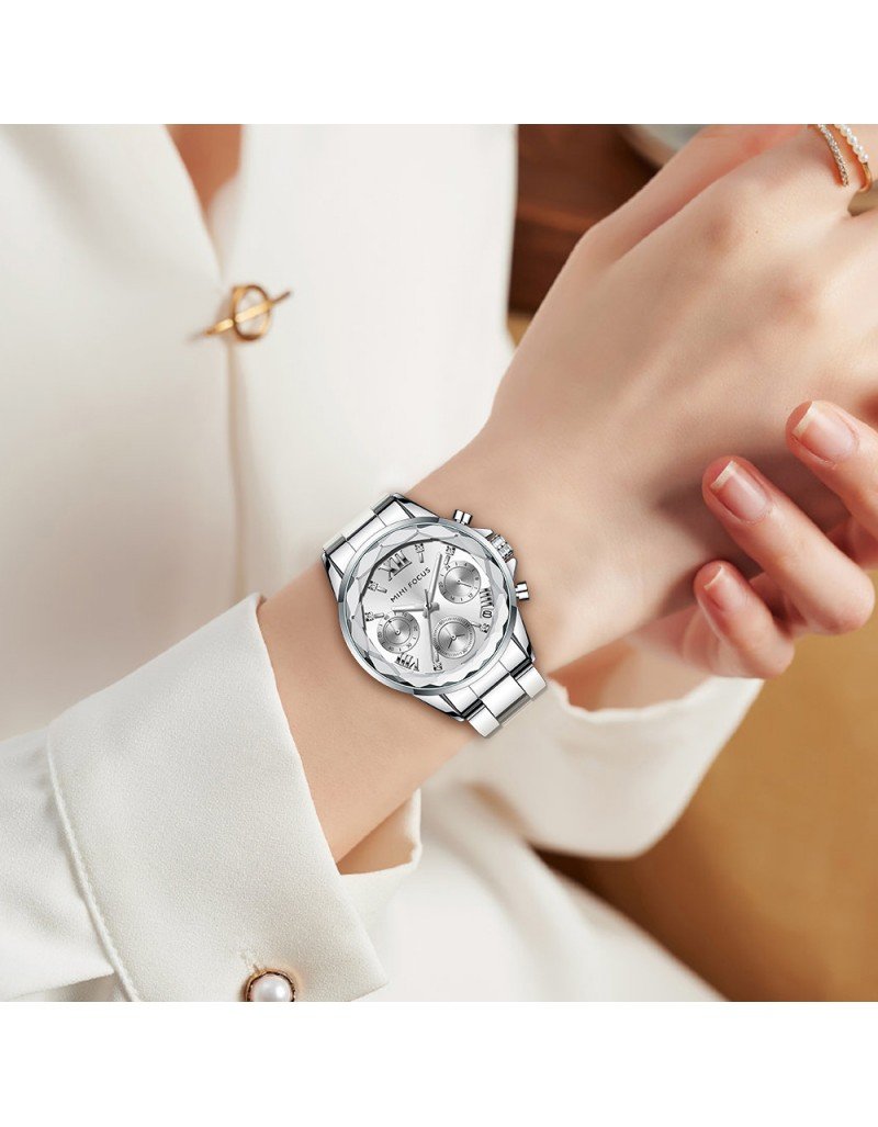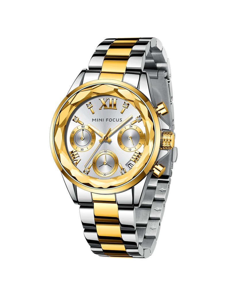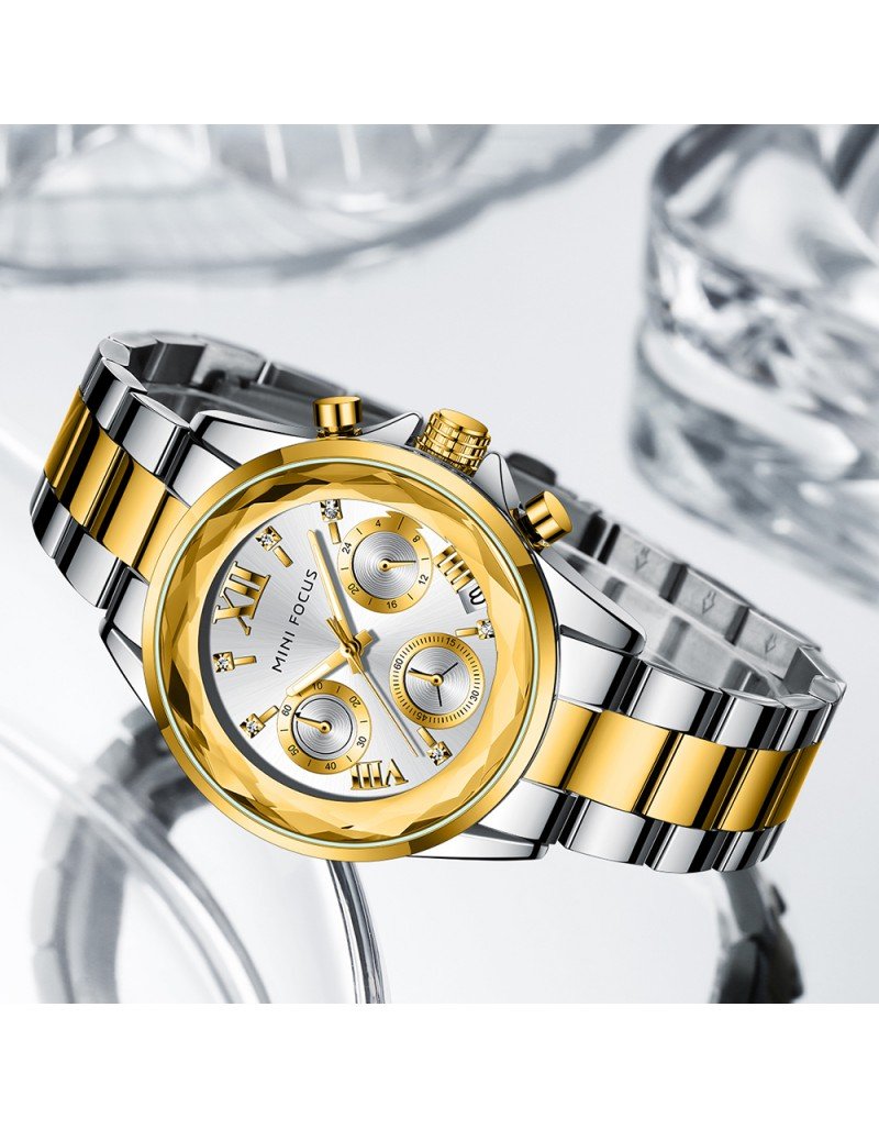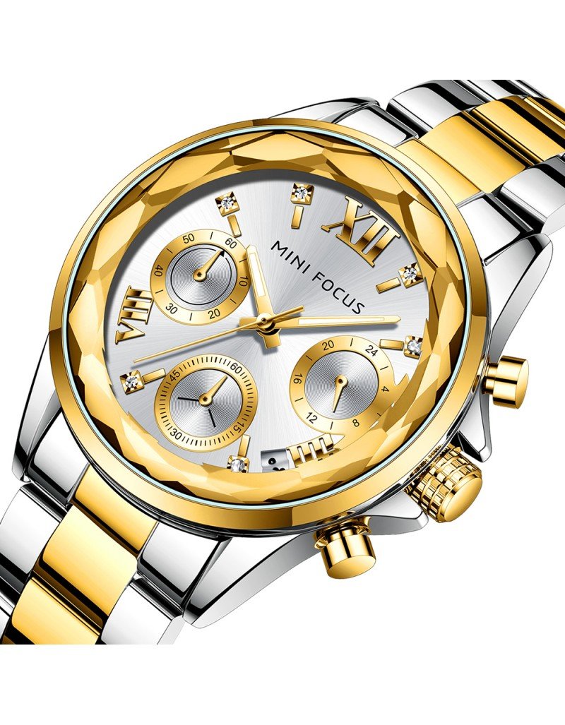 MINI FOCUS Montres mode pour femmes Marque: MINI FOCUS (MINIFOCUS) Style: Mode, Décontracté, Affaires, Luxe, Sport Caractéristique principale: 1. montre de conception de luxe, style vestimentaire de mode 2. Nouvelles tendances de la mode montre à bracelet en acier inoxydable. 3. Garantie de mouvement de 12 mois Spécifications: Diamètre du cadran: 42.9mm Épaisseur du boîtier: 9.4mm Longueur de montre: 190mm Largeur de bande: 16mm Poids de la montre: 91g Mouvement: Quartz (batterie nécessaire) Matériau du miroir: Hardlex Type de fermoir: Fermoir pliant avec sécurité Fonction: Calendrier; Boîtier en diamant; Pointeurs lumineux Résistance à l’eau: étanche au quotidien (pas pour nager ou prendre une douche) Occasion appropriée: Parfait pour toutes les occasions et événements: fête, anniversaire, affaires, décontracté, sports de plein air, activités intérieures ou utilisation quotidienne Ajouter à la liste de souhaits Ajouter à la liste de souhaits