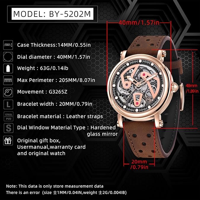 Montre Automatique BENYAR pour Homme – ÉlĂ©gance & IngĂ©nierie Horlogère Design Squelette RaffinĂ© Montre totalement squelettisĂ©e, rĂ©vĂ©lant les mĂ©canismes internes complexes d’un mouvement mĂ©canique. Bracelet en cuir noir et boĂ®tier en acier inoxydable pour un look moderne et sophistiquĂ©. Mouvement Automatique – Écologique & Fiable Fonctionne grâce aux mouvements du poignet, sans besoin de batterie. Un choix pratique et respectueux de l’environnement pour ceux qui veulent rĂ©duire leur empreinte carbone. Cadran Transparent – ÉlĂ©gant & Polyvalent Le fond transparent permet d’admirer les dĂ©tails prĂ©cis du mouvement mĂ©canique. Convient aussi bien pour des occasions formelles que dĂ©contractĂ©es, grâce Ă  son design Ă©purĂ© et ses matĂ©riaux haut de gamme. Un Cadeau IdĂ©al Parfait pour un anniversaire, une remise de diplĂ´me, un anniversaire de mariage, ou tout simplement pour faire plaisir Ă  un proche. Service Après-Vente & Garantie ContrĂ´le qualitĂ© strict avant expĂ©dition pour garantir une fiabilitĂ© optimale. Garantie 1 an et remboursement sous 60 jours pour un achat en toute confiance. Un bijou d’horlogerie, alliant sophistication et technologie, idĂ©al pour les passionnĂ©s de montres Ajouter à la liste de souhaits Ajouter à la liste de souhaits