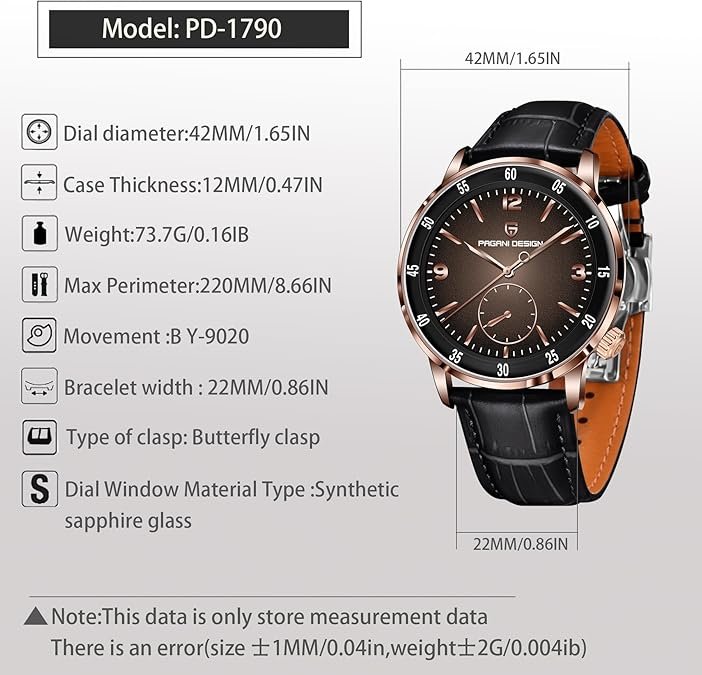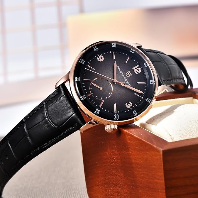 Montre Automatique Pagani Design PD-1790 pour Homme – ÉlĂ©gance & Performance Design ÉlĂ©gant & Fonctionnel BoĂ®tier de 42 mm avec bracelet en cuir pour un look sobre et raffinĂ©. Chiffres arabes sur la lunette pour une lecture de l’heure facile. Couronne placĂ©e Ă  4 heures, ajoutant une touche esthĂ©tique unique. Mouvement Automatique – PrĂ©cision & LongĂ©vitĂ© Sans batterie, fonctionne grâce aux mouvements du poignet. Pour une prĂ©cision optimale, portez la montre plus de 8 heures par jour ou remontez-la manuellement (20 tours de couronne avant la première utilisation). MatĂ©riaux Haut de Gamme Verre saphir rĂ©sistant aux rayures et Ă  l’usure. BoĂ®tier en acier inoxydable robuste. Bracelet en cuir souple et confortable, facilement ajustable. ÉtanchĂ©itĂ© 100M ProtĂ©gĂ©e contre la transpiration, la pluie et les Ă©claboussures. Non adaptĂ©e Ă  la baignade, la natation ou la plongĂ©e. Évitez le contact avec la vapeur d’eau pour prĂ©server ses performances d’étanchĂ©itĂ©. Coffret & Garantie 1 montre automatique Pagani Design PD-1790 1 boĂ®te originale 1 manuel d’utilisation 1 carte de garantie Service Client de QualitĂ© Garantie d’un achat en toute confiance. En cas de problème, notre Ă©quipe est disponible pour vous apporter une solution rapide et efficace. Un mĂ©lange parfait entre sophistication et prĂ©cision – L’accessoire idĂ©al pour toutes les occasions ! Ajouter à la liste de souhaits Ajouter à la liste de souhaits